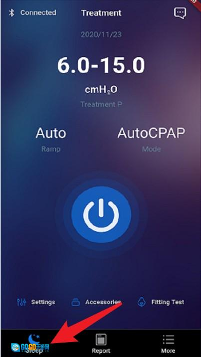 3、点击底部的Sleep选项进入控制界面后,就能手动开启或关闭呼吸机的治疗功能了。