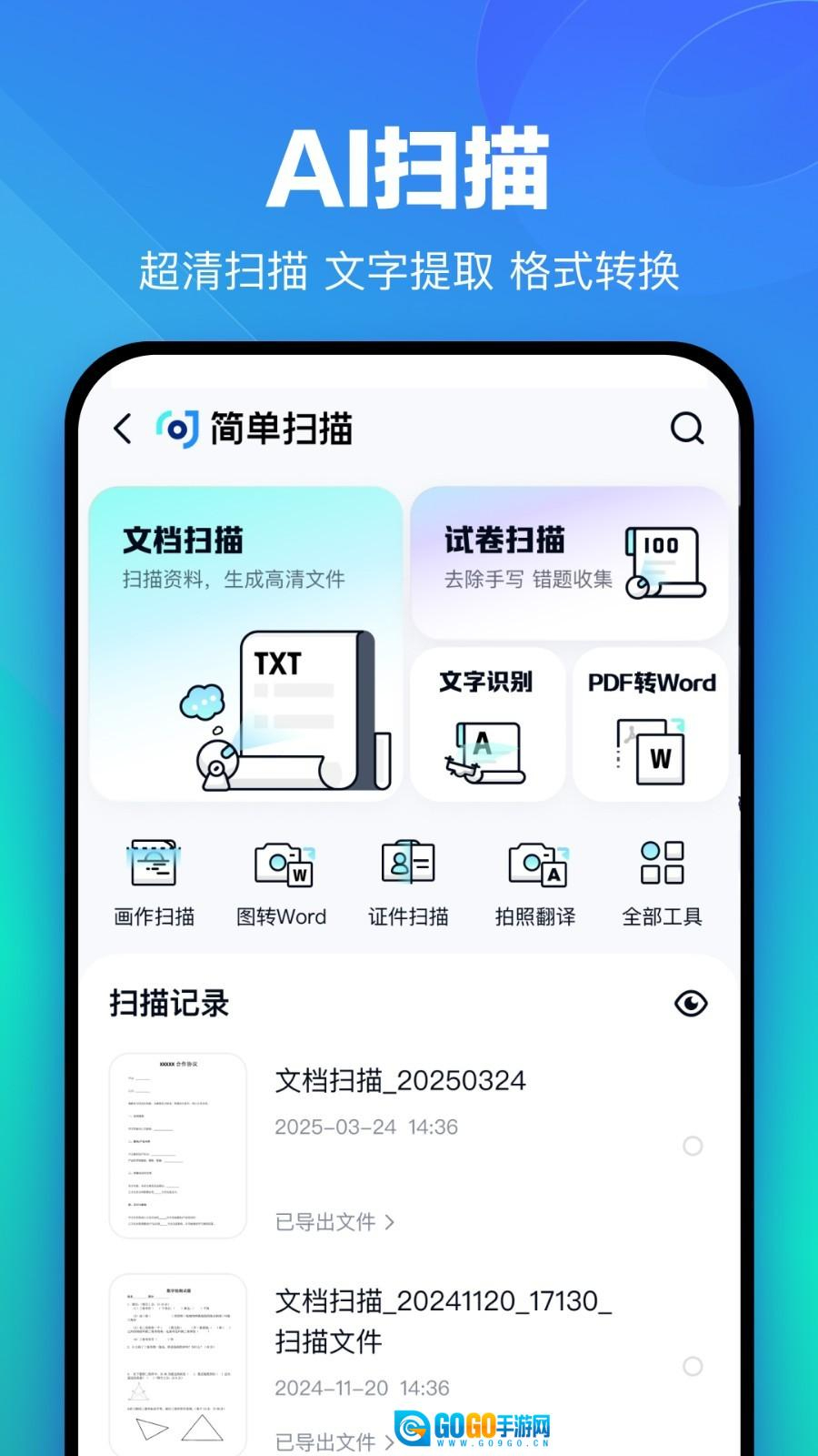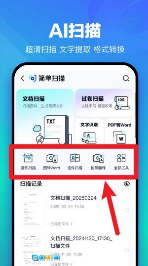 3、进入扫描功能页面后,可使用图片扫描、文档转Word、证件扫描、拍照翻译等多种AI智能工具。