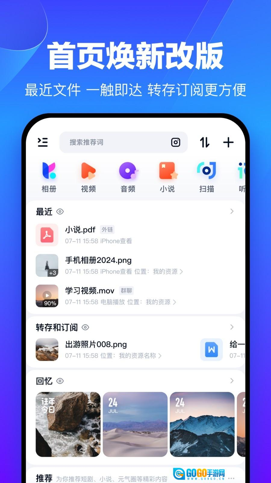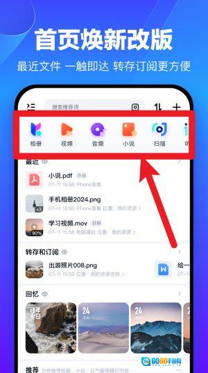 2在新版首页界面里,大家能借助顶部的快捷入口,快速进入相册、视频、音频、小说以及扫描等常用功能模块。