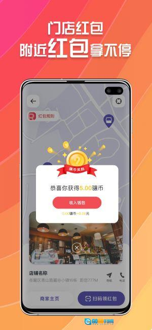 3、进入地图定位界面后,当靠近实体门店时,系统会自动弹出附近红包的提醒,用户点击该提醒即可将红包领取到个人钱包里。