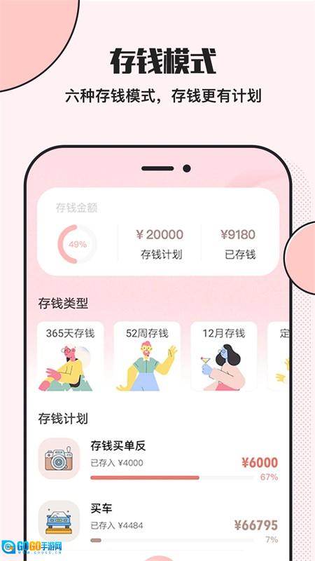 3、六种存钱模式可助力制定合理的存钱计划,再搭配精心设计的暖心记账模式,就能实现存钱与记账兼顾,让你毫无后顾之忧。