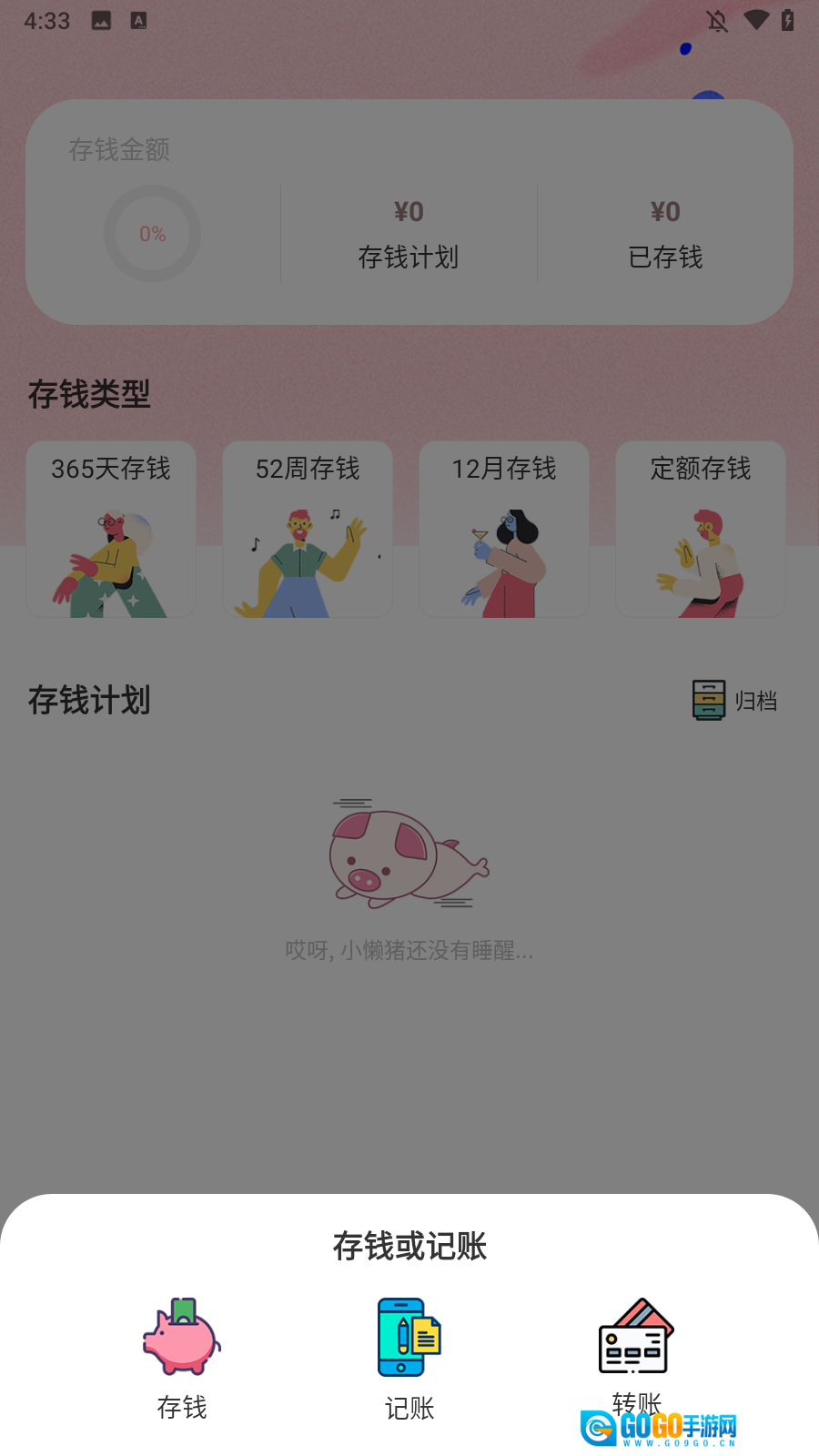 2、点击中间的小猪可以选择存钱、记账或者转账。