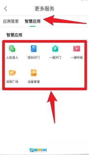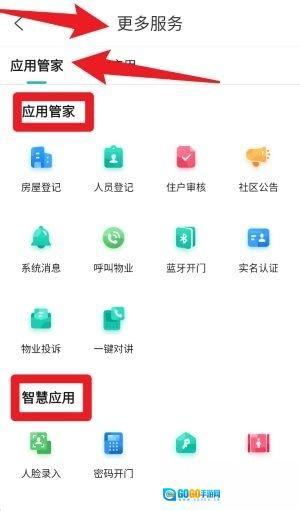 3、点击“更多服务”进入“应用管家”,可查看所有社区功能应用,涵盖社区公告、物业报修、门禁管理等服务。