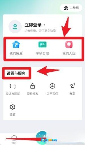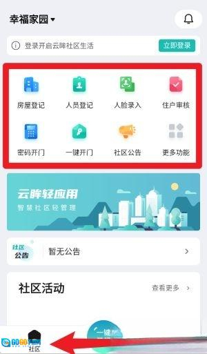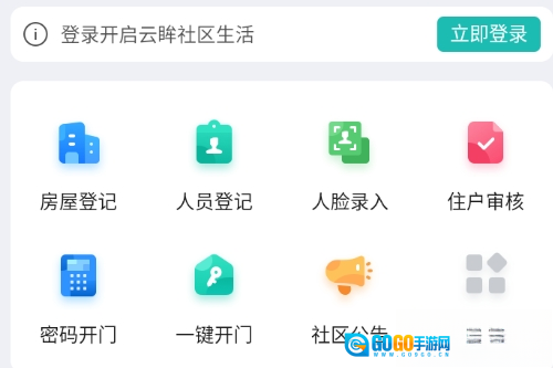 2、进入“社区”首页后可查看房屋登记、人员登记、人脸录入、一键开门等多个常用功能模块,操作便捷高效。