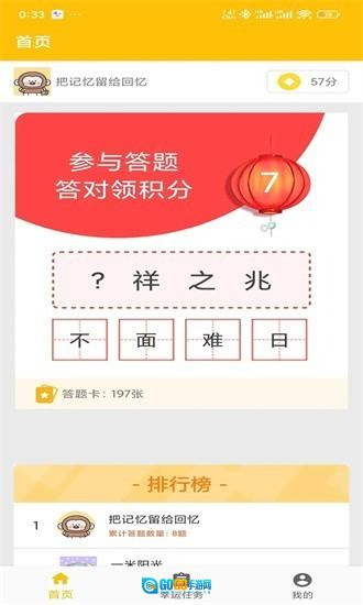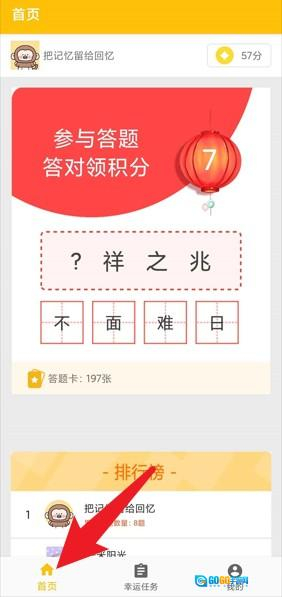 2、首页呈现当前题目、积分与排行榜信息,参与答题能够获得奖励积分并提升排名。
