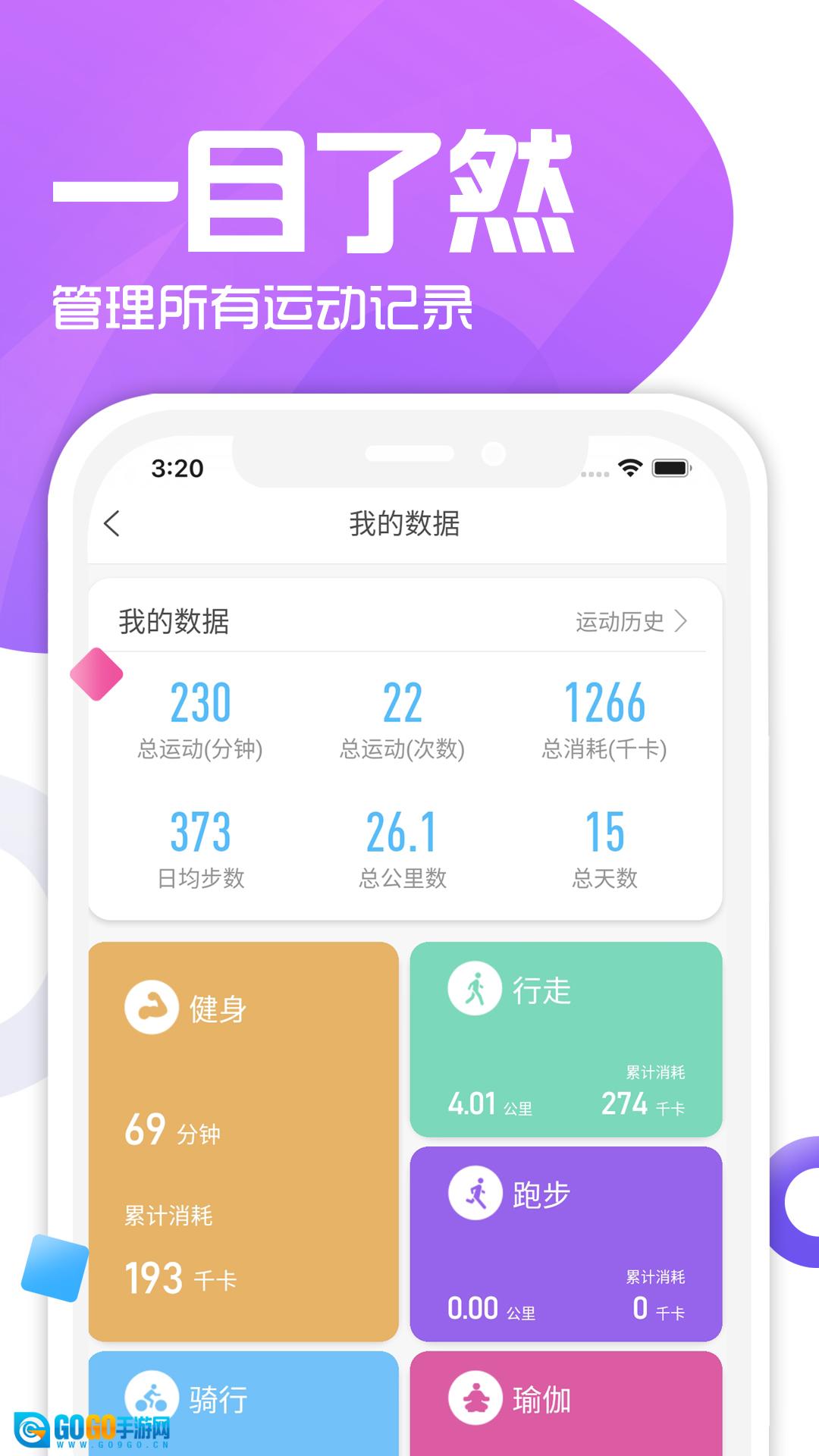 1、数据追踪:自动记录汇总运动信息,各项数据清晰呈现。