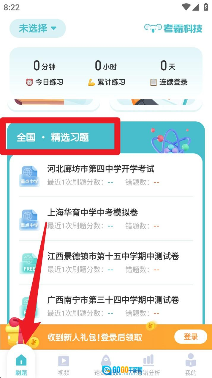1. 进入首页默认是刷题页,可在上方选择省市学校,系统将推荐相关试卷并显示最近的练习数据。