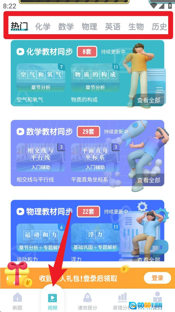 2. 点击底部的视频按钮,进入各学科同步课程区域,支持化学、物理、数学等多章节视频学习。