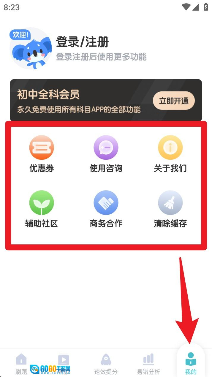 5. 打开我的页面,完成注册登录后即可永久激活全科会员,支持使用优惠券、联系客服等功能模块。