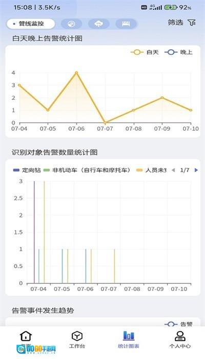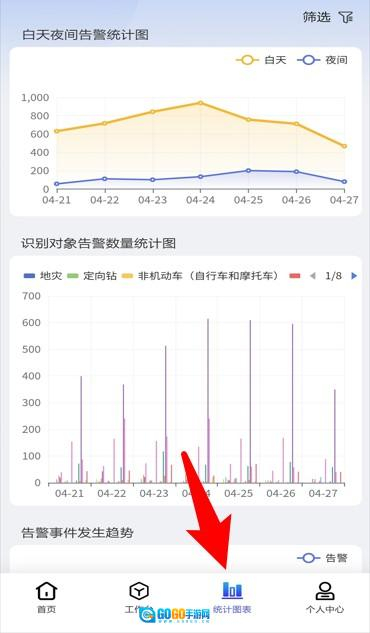 4.点击底部统计图表按钮,可查看告警数量、趋势及识别对象图表,辅助数据分析。