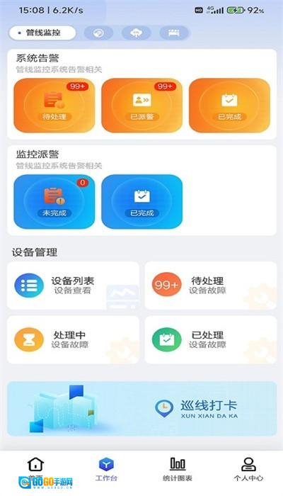 3.在工作台页面可管理设备告警,查看待处理、已处理和派警情况,分类清晰便于操作。