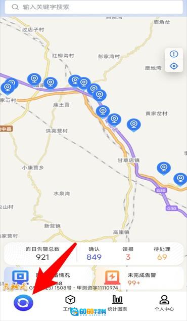 2.登录成功后进入地图总览界面,可查看各地监控点告警状态,点击左下角图标可切换主菜单。