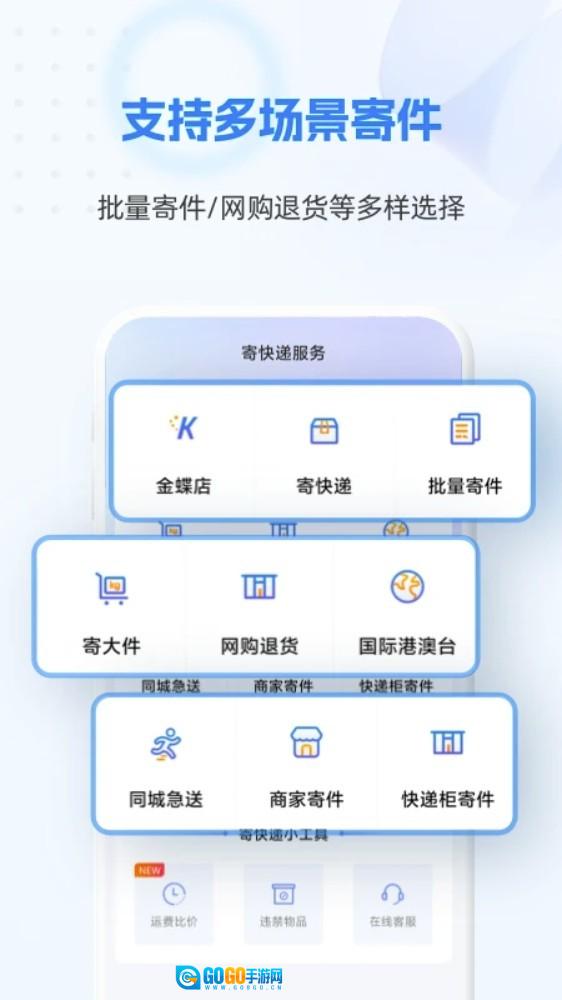 3.点击寄快递标签进入寄件服务页,支持批量寄件、网购退货、商家寄件等多种类型,选择更灵活。