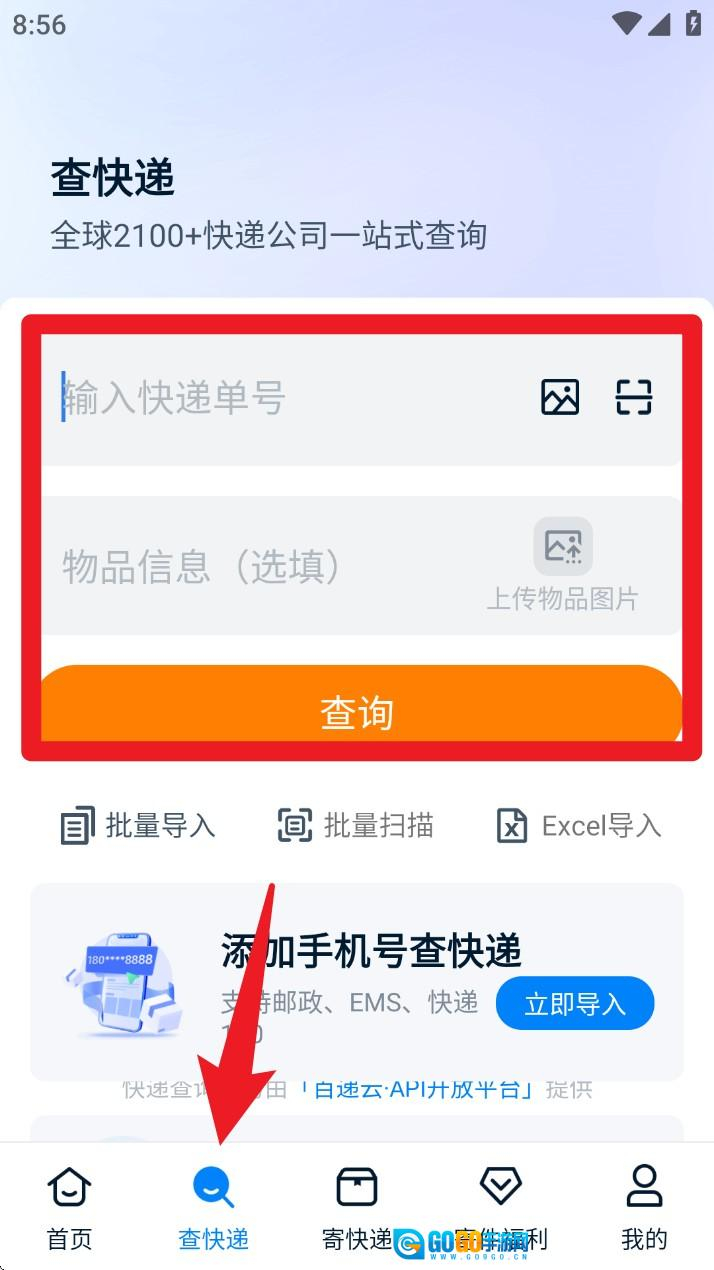 2.点选底部查快递,输入快递单号或扫码查询包裹状态,支持添加物品信息和图片,方便多单管理。