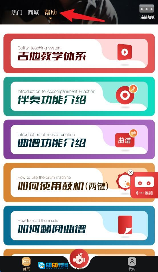 3、点击顶部帮助可查看吉他教学、鼓机使用等详细功能说明,适合新手快速上手。