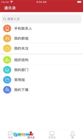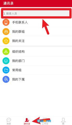 2、在通讯录页面中可以通过关键词搜索人员,并快速访问组织结构、我的群组及常用联系人列表。
