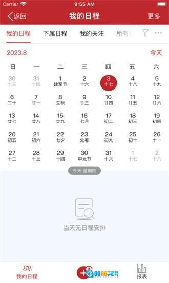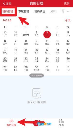 3、打开我的日程界面后可通过日历视图查看每日安排,并支持查看下属与关注对象的日程计划。
