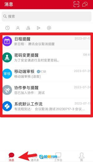 1、点击底部消息按钮可查看包括日程提醒、协作参与、密码变更等在内的各类系统通知信息。
