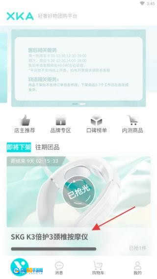 1、进入首页就能看到店铺推荐等板块,展示SKG按摩仪等商品,附带“即将下架”等提醒;