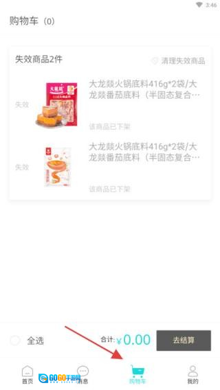 3、打开购物车页面,会显示大龙燚火锅底料等失效商品列表,底部设有全选、结算等操作按钮。
