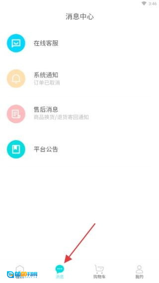 2、切换至消息中心,可查看在线客服、系统通知、售后消息及平台公告等分类信息;