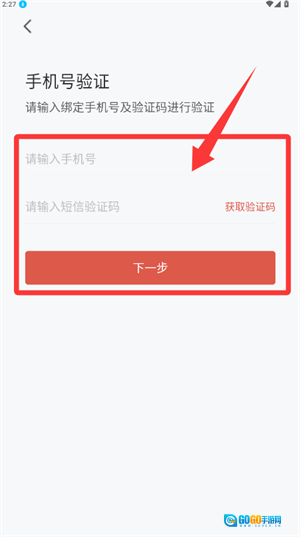 2、在手机号验证页面填写号码与验证码,点击下一步即可完成验证。