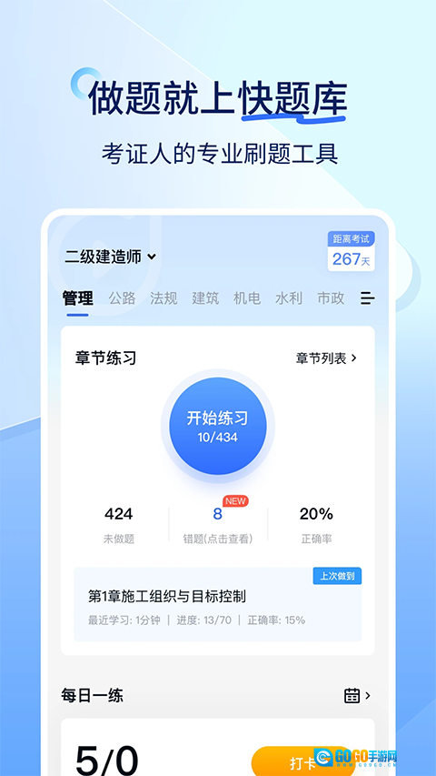 建造师快题库是一款实用性极强的建造师考试辅助软件,致力于为备考建造师考试的考生提供便捷的移动复习工具。该应用涵盖了最丰富的题型,能助力用户熟悉各类题型,从而提升考试信心,支持随时刷题和学习知识点,目前新增了计时做题功能。依据各科目最新考试大纲命题,紧密贴合教材,帮助用户在更短时间内掌握核心要点!同时收录近五年全部真题,还设有章节练习、模拟试题以及考前押题等板块。