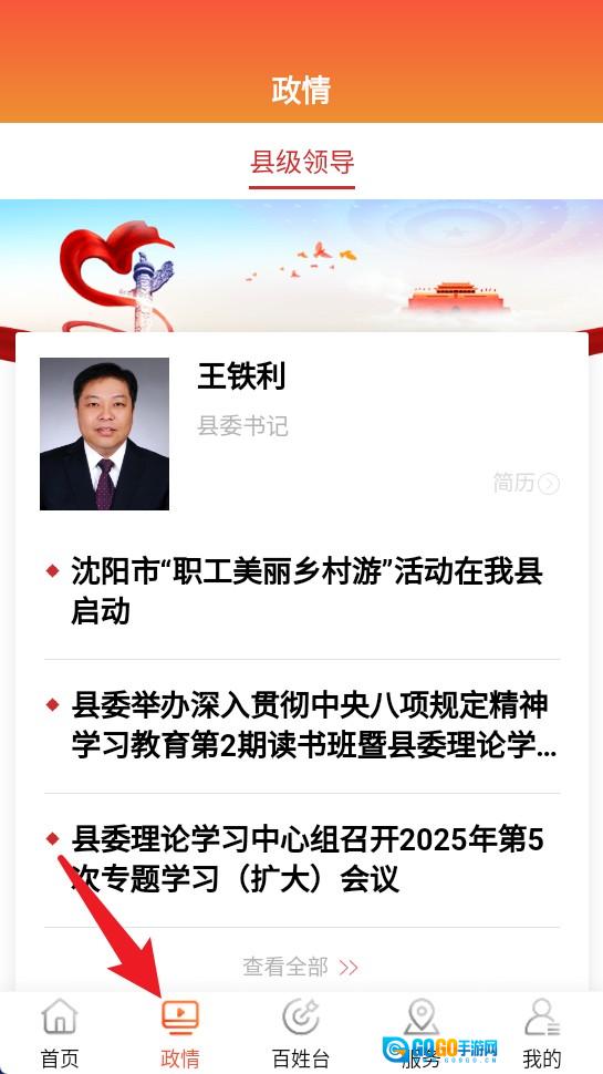 2、点击底部政情按钮进入领导信息专区,查看县级领导简介及相关活动动态。