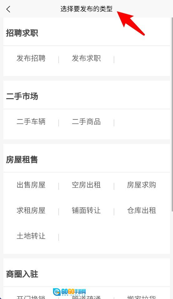 4、点击页面中间的发布按钮,进入分类页面后,选择要发布的内容类型,例如招聘、二手房等类别。