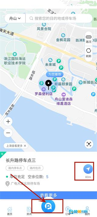 6、停车时点击中间P按钮,可以查看当前位置附近的停车场,还可以一键导航到指定停车场。