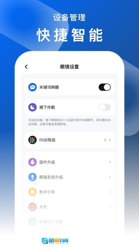 1、固件更新支持:能够在线检测智能眼镜的最新固件版本,并完成设备系统升级,让用户持续获得功能优化与新特性。