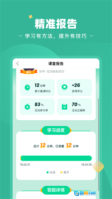 2、操作便捷流畅:界面直观清晰,功能模块划分明确。学生能够自主完成听课、练习与复习的全部流程。