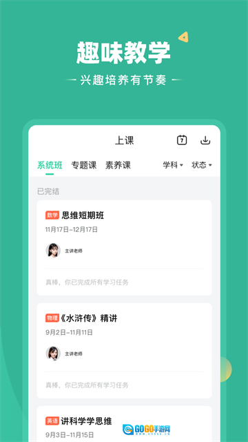 1、课程体系完善:紧密遵循新课程标准与主流教科书版本,搭建起覆盖小学至高中全学科的综合课程体系,兼具同步性与先进性。 2、互动课堂体验:提供多维度互动功能,包括举手答题、弹幕提问以及小组研讨等形式,助力提升学生的专注力与课堂参与度。