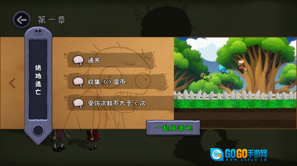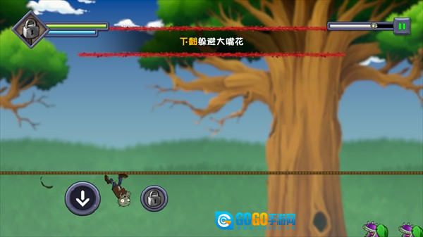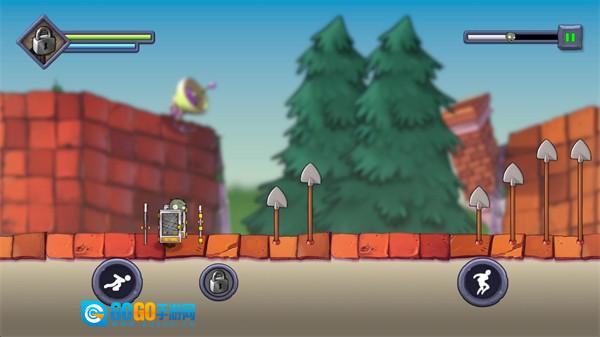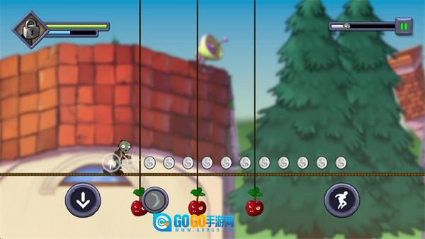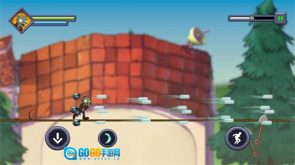 3、进入关卡后僵尸会自动前进,在屏幕左右的上下分别是跳跃和切换方向,有时向下的按键会变成冲刺。