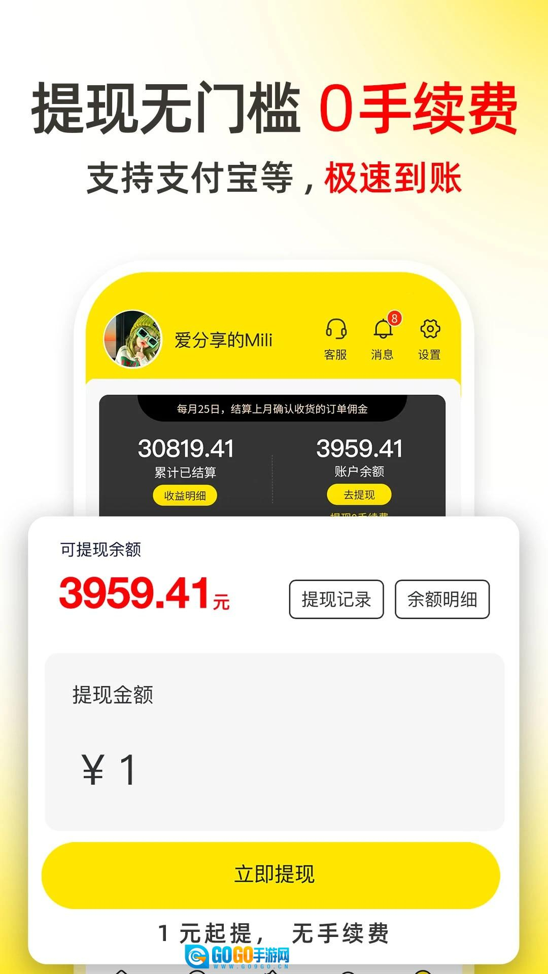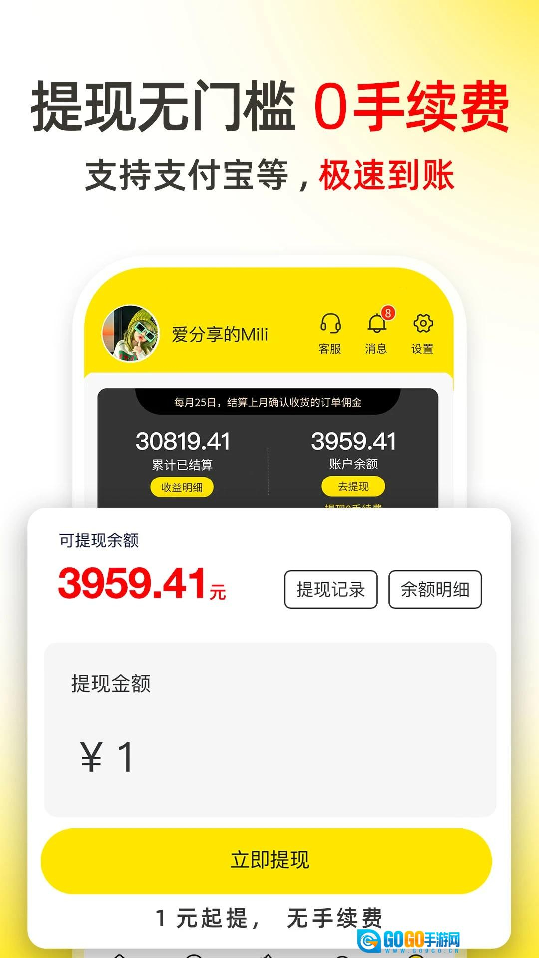 4、返利查看与提现:用户在完成购买后,可通过软件查看返利明细及账户余额,待余额满足特定金额要求时,即可提交提现申请。