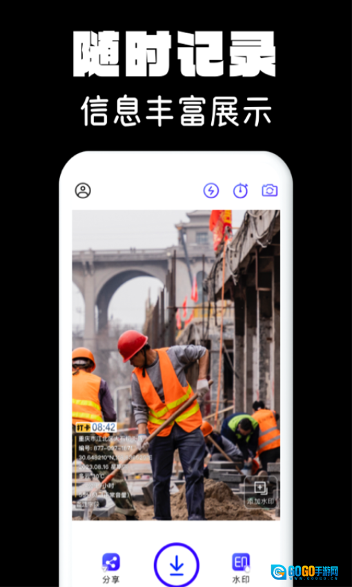 1、水印拍照功能能够在拍摄画面中实时叠加时间、地点、天气等动态信息,只需一键操作就能生成带有认证标记的现场记录照片。