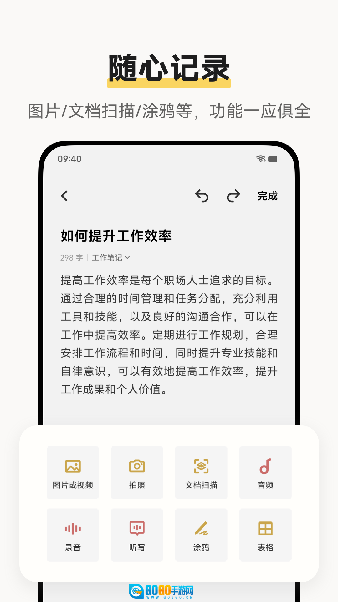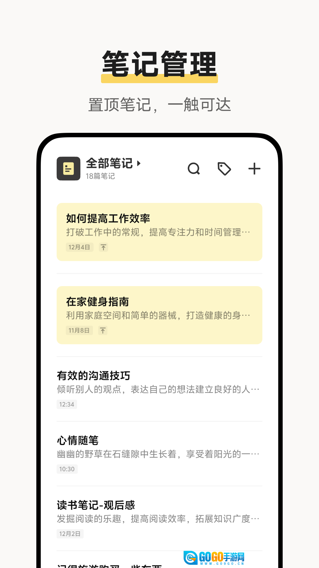 1、融合富文本编辑、图文混排、语音输入与待办管理,打造全场景高效笔记工具。