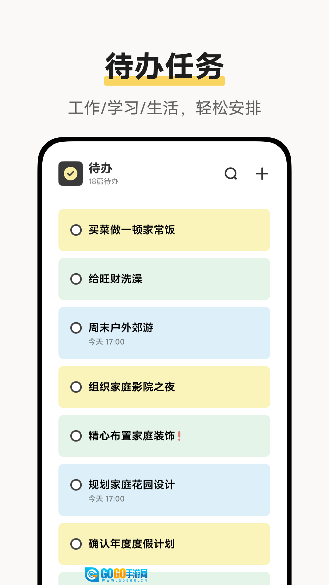 待办事项一键增删改并自动排序,日记、卡片等模板,满足多场景记录需求。