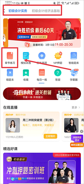 2、接着在上方选择练习《初级会计实务》或《初级会计经济法基础》,再在下方点击章节练习。