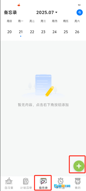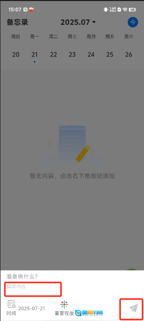3、点击“+”按钮,输入备忘录内容后点击发送图标,就能完成添加操作。