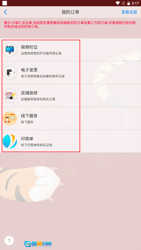 2、在个人中心选择我的订单,订单分为不同模块,如视频栏位、电子发票、店铺装修、线下服务等。