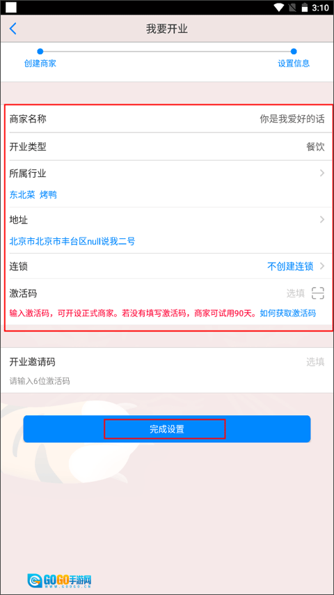 3、填写所属行业、具体地址,选择是否连锁店等选项,最后点击完成设置即可创建成功。