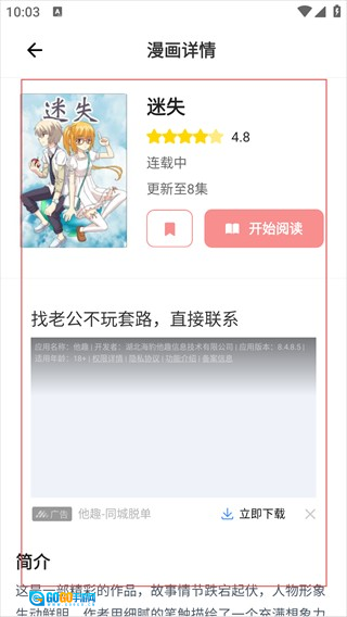 4、在漫画详情页,用户不仅能查看漫画评分、更新集数等基础信息,还会看到相关的广告内容,并且可以点击【开始阅读】按钮进入漫画阅读界面。