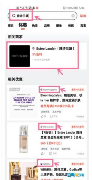1、不少用户想购买某款产品,却不清楚哪些网站有折扣活动,这时直接在55海淘的搜索栏进行搜索即可,比如搜索雅诗兰黛。