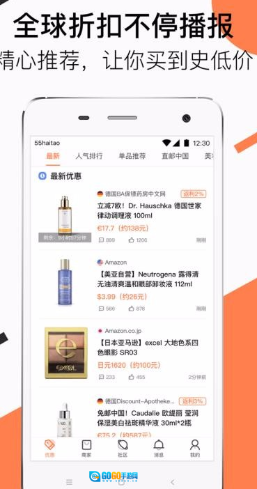 55海淘是一个24小时推送全球折扣通知的综合海淘导购服务平台,目前已成为国内领先的海淘返利平台。在这里,您既能随时掌握全球折扣动态,下单时还能享受高额返利。平台为国内数百万海淘用户提供贴心服务,全天24小时不间断更新全球折扣信息,助您不错过任何心仪好物。此外,平台汇聚了数百万海淘用户的分享内容,提供完整详尽的海淘教程,您也可以参与团购;同时还有丰富的新手入门指南与海淘技巧,让每一位用户都能轻松买到喜爱的海外商品。