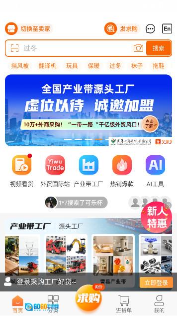 找货与求购:支持按商品品类、产业带进行搜索筛选,也可主动发布包含数量、交货周期等详情的求购信息。