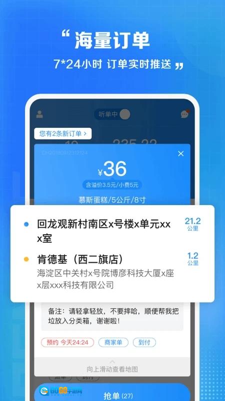 全流程接单与配送管理:集成从听单、抢单/接单、导航至取件点、确认送达到最后完成签收的完整工作流。支持查看订单详情、联系客户、上报进度等操作。