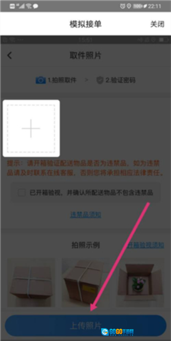 3、上门取件,点击我已就位,点击验证取件,对配送物品拍照并上传物品照片(物品要拍全,二次包装的物品,开箱验货拍物品本身,不要只拍外包装,封口的餐饮订单拍两张,一张小票照片,一张物品和小票的组合照要拍全)。
