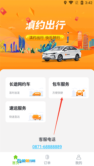 1、首先完成安装操作,随后进入主页面,会看到长途网约车、包车服务、速运服务这几个选项,我们选择包车服务。