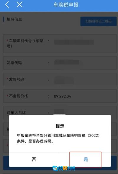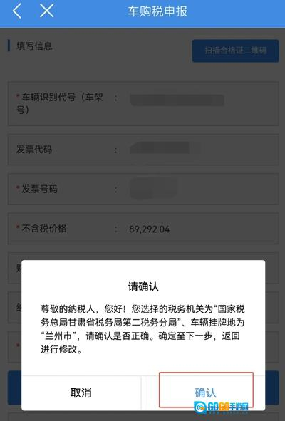 2、填写车辆识别代号(车架号),自动带出发票代码;填写发票号码,填写不含税价格,点击下一步,弹出如下提示框;
